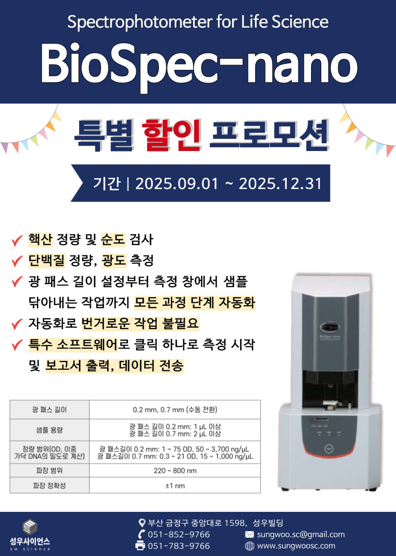 페이지 정보 BioSpec-Nano 특별 할인 프로모션! 작성일 2025.08.27 17:49 목록 본문 관련링크 https://sungwoosc.mycafe24.com/bbs/board.php?bo_table=product&wr_id=90 21회 연결 이전글머크 SQ240 30% 특별할인 이벤트 25.09.12 다음글C-900 (Pure Essential Flash Chromatography System) 특별할인 이벤트 ! 25.08.27